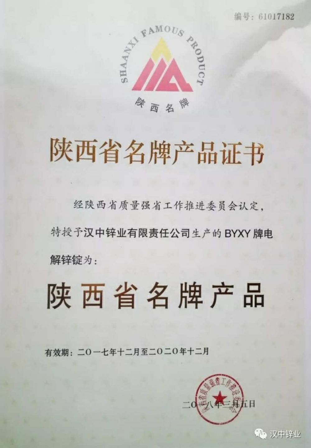 公司生產的BYXY牌電解鋅錠順利通過陜西名牌產品復評。2018年5月10日在省政府綜合樓4樓會議室,公司代表和100多家省內名牌產品企業參加了陜西省質量技術監督局組織的省名牌產品授牌儀式,現場領取了陜西省質量強省工作推進委員會頒發的證書和獎牌。
